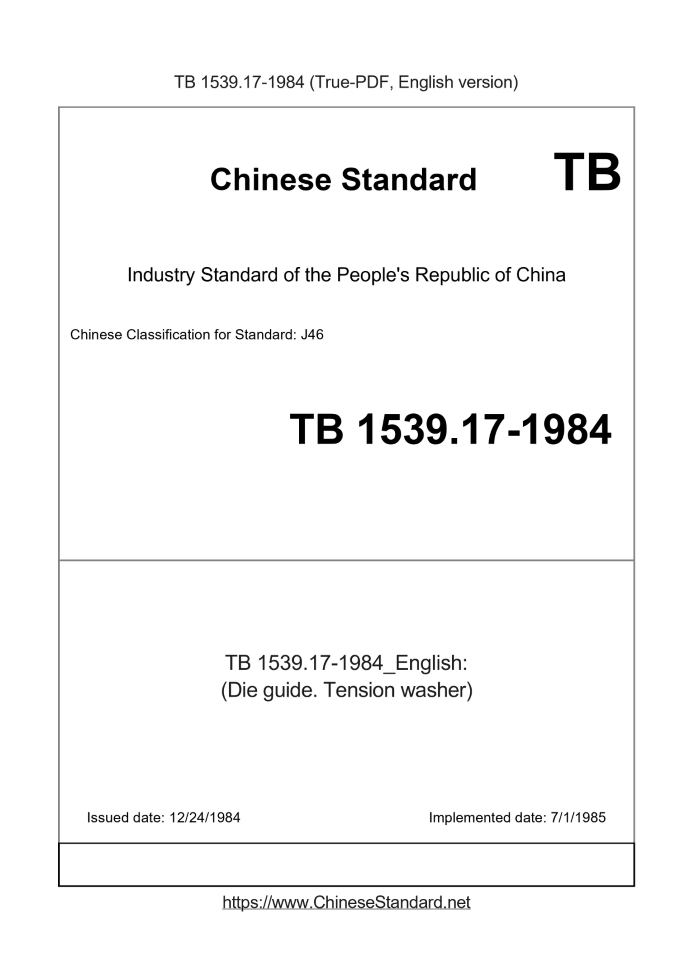 Delivery: <= 2 days. True-PDF full-copy in English will be manually translated and delivered via email. TB 1539.17-1984: (Die guide. Tension washer) Status: Obsolete