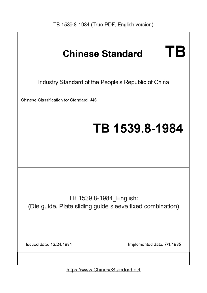 Delivery: <= 2 days. True-PDF full-copy in English will be manually translated and delivered via email. TB 1539.8-1984: (Die guide. Plate sliding guide sleeve fixed combination) Status: Obsolete