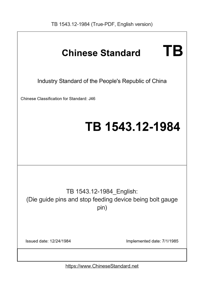 Delivery: <= 2 days. True-PDF full-copy in English will be manually translated and delivered via email. TB 1543.12-1984: (Die guide pins and stop feeding device being bolt gauge pin) Status: Obsolete