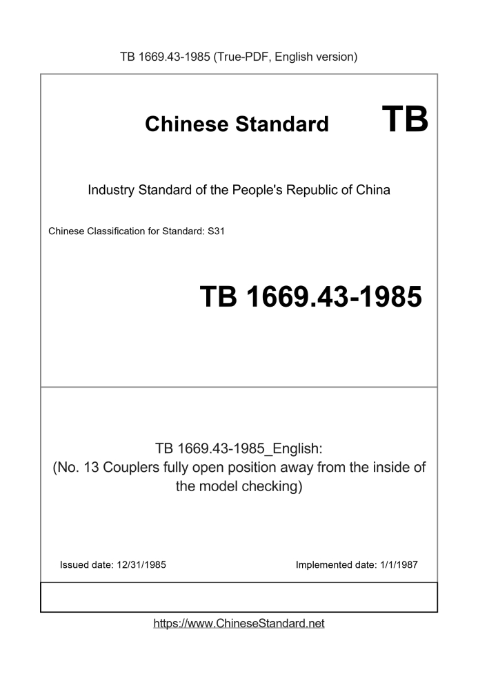 Basic dataStandard ID: TB 1669.43-1985 (TB1669.43-1985)Description (Translated English): (No. 13 Couplers fully open position away from the inside of the model checking) Sector / Industry: Railway & Train Industry Standard Date of Issue: 12/31/1985 Date of Implementation: 1/1/1987 Tips & Frequently Asked Questions:Question 1: How long will the true-PDF of TB 1669.43-1985_English be delivered?Answer: Upon your order, we will start to translate TB 1669.43-1985_English as soon as possible, and keep you informed of the progress. The lead time is typically 1 ~ 3 working days. The lengthier the document the longer the lead time.Question 2: Can I share the purchased PDF of TB 1669.43-1985_English with my colleagues?Answer: Yes. The purchased PDF of TB 1669.43-1985_English will be deemed to be sold to your employer/organization who actually pays for it, including your colleagues and your employer's intranet.Question 3: Does the price include tax/VAT?Answer: Yes. Our tax invoice, downloaded/delivered in 9 seconds, includes all tax/VAT and complies with 100+ countries' tax regulations (tax exempted in 100+ countries) -- See Avoidance of Double Taxation Agreements (DTAs): List of DTAs signed between Singapore and 100+ countriesQuestion 4: Do you accept my currency other than USD?Answer: Yes. If you need your currency to be printed on the invoice, please write an email to Sales@ChineseStandard.net. In 2 working-hours, we will create a special link for you to pay in any currencies. Otherwise, follow the normal steps: Add to Cart -- Checkout -- Select your currency to pay. |