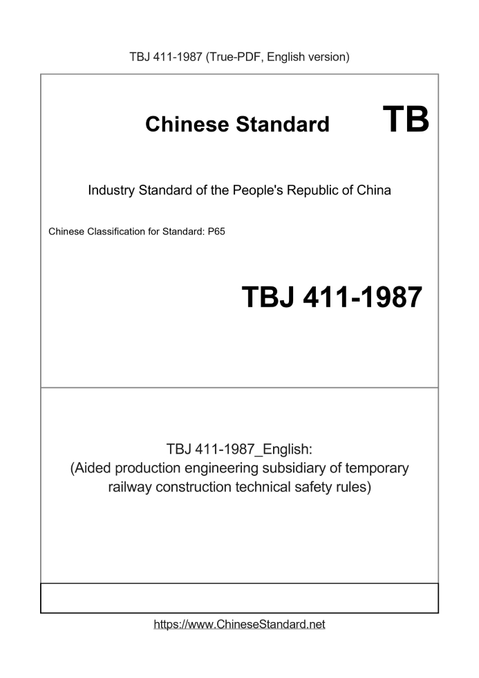 Delivery: <= 6 days. True-PDF full-copy in English will be manually translated and delivered via email. TBJ411-1987: (Aided production engineering subsidiary of temporary railway construction technical safety rules) Status: Obsolete