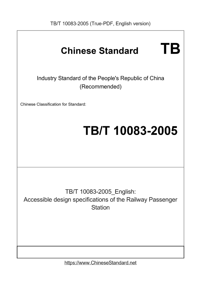 Basic dataStandard ID: TB/T 10083-2005 (TB/T10083-2005)Description (Translated English): Accessible design specifications of the Railway Passenger Station Sector / Industry: Railway & Train Industry Standard (Recommended) Tips & Frequently Asked Questions:Question 1: How long will the true-PDF of TB/T 10083-2005_English be delivered?Answer: Upon your order, we will start to translate TB/T 10083-2005_English as soon as possible, and keep you informed of the progress. The lead time is typically 1 ~ 3 working days. The lengthier the document the longer the lead time.Question 2: Can I share the purchased PDF of TB/T 10083-2005_English with my colleagues?Answer: Yes. The purchased PDF of TB/T 10083-2005_English will be deemed to be sold to your employer/organization who actually pays for it, including your colleagues and your employer's intranet.Question 3: Does the price include tax/VAT?Answer: Yes. Our tax invoice, downloaded/delivered in 9 seconds, includes all tax/VAT and complies with 100+ countries' tax regulations (tax exempted in 100+ countries) -- See Avoidance of Double Taxation Agreements (DTAs): List of DTAs signed between Singapore and 100+ countriesQuestion 4: Do you accept my currency other than USD?Answer: Yes. If you need your currency to be printed on the invoice, please write an email to Sales@ChineseStandard.net. In 2 working-hours, we will create a special link for you to pay in any currencies. Otherwise, follow the normal steps: Add to Cart -- Checkout -- Select your currency to pay. |