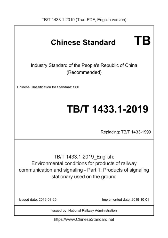 Delivery: <= 4 days. True-PDF full-copy in English will be manually translated and delivered via email. TB/T 1433.1-2019: Environmental conditions for products of railway communication and signaling - Part 1: Products of signaling stationary used on the ground Status: Valid TB/T 1433.1: Historical versions