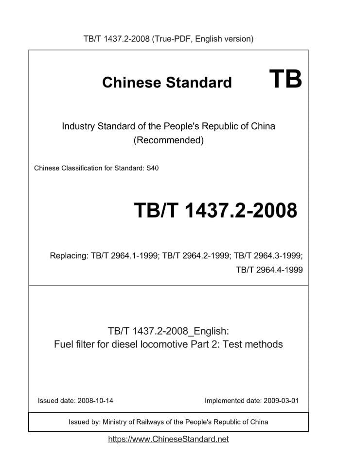 Basic dataStandard ID: TB/T 1437.2-2008 (TB/T1437.2-2008)Description (Translated English): Fuel filter for diesel locomotive Part 2: Test methods Sector / Industry: Railway & Train Industry Standard (Recommended) Classification of Chinese Standard: S40 Classification of International Standard: 45.060.10 Word Count Estimation: 12,123 Date of Issue: 2008-10-14 Date of Implementation: 2009-03-01 Older Standard (superseded by this standard): TB/T 2964.1-1999; TB/T 2964.2-1999; TB/T 2964.3-1999; TB/T 2964.4-1999 Quoted Standard: TB/T 1437.1-2008; TB/T 2871-1998; ISO 11841-1 Regulation (derived from): Industry standard filing Notice 2010 No. 8 (No. 128 overall); Railway Technology (2013) 64 Issuing agency(ies): Ministry of Railways of the People's Republic of China Summary: This standard specifies the diesel fuel filter and filter structure and performance test test methods, including test equipment, test oil, test procedures and test records and so on. This standard applies to diesel fuel filter with filter media and filter performance test. Tips & Frequently Asked Questions:Question 1: How long will the true-PDF of TB/T 1437.2-2008_English be delivered?Answer: Upon your order, we will start to translate TB/T 1437.2-2008_English as soon as possible, and keep you informed of the progress. The lead time is typically in 9 seconds (download/delivered in 9 seconds). The lengthier the document the longer the lead time.Question 2: Can I share the purchased PDF of TB/T 1437.2-2008_English with my colleagues?Answer: Yes. The purchased PDF of TB/T 1437.2-2008_English will be deemed to be sold to your employer/organization who actually pays for it, including your colleagues and your employer's intranet.Question 3: Does the price include tax/VAT?Answer: Yes. Our tax invoice, downloaded/delivered in 9 seconds, includes all tax/VAT and complies with 100+ countries' tax regulations (tax exempted in 100+ countries) -- See Avoidance of Double Taxation Agreements (DTAs): List of DTAs signed between Singapore and 100+ countriesQuestion 4: Do you accept my currency other than USD?Answer: Yes. If you need your currency to be printed on the invoice, please write an email to Sales@ChineseStandard.net. In 2 working-hours, we will create a special link for you to pay in any currencies. Otherwise, follow the normal steps: Add to Cart -- Checkout -- Select your currency to pay. |
