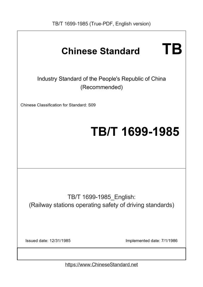 Delivery: <= 3 days. True-PDF full-copy in English will be manually translated and delivered via email. TB/T 1699-1985: (Railway stations operating safety of driving standards)