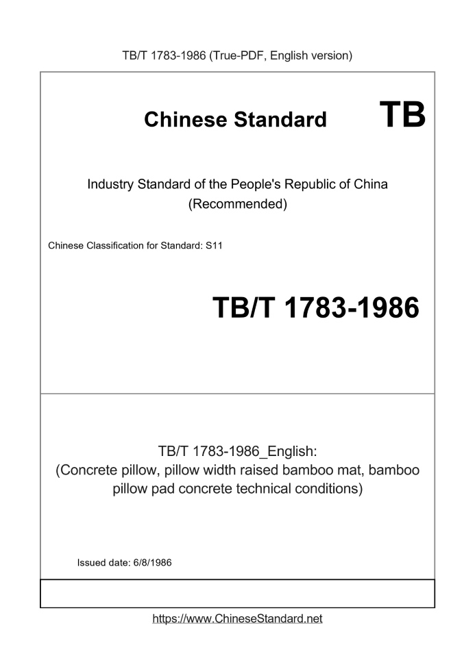 Delivery: <= 3 days. True-PDF full-copy in English will be manually translated and delivered via email. TB/T 1783-1986: (Concrete pillow, pillow width raised bamboo mat, bamboo pillow pad concrete technical conditions) Status: Obsolete