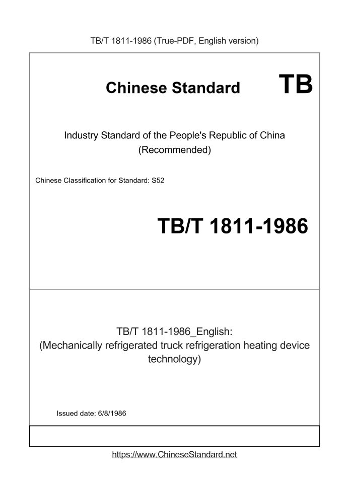 Delivery: <= 2 days. True-PDF full-copy in English will be manually translated and delivered via email. TB/T 1811-1986: (Mechanically refrigerated truck refrigeration heating device technology) Status: Obsolete