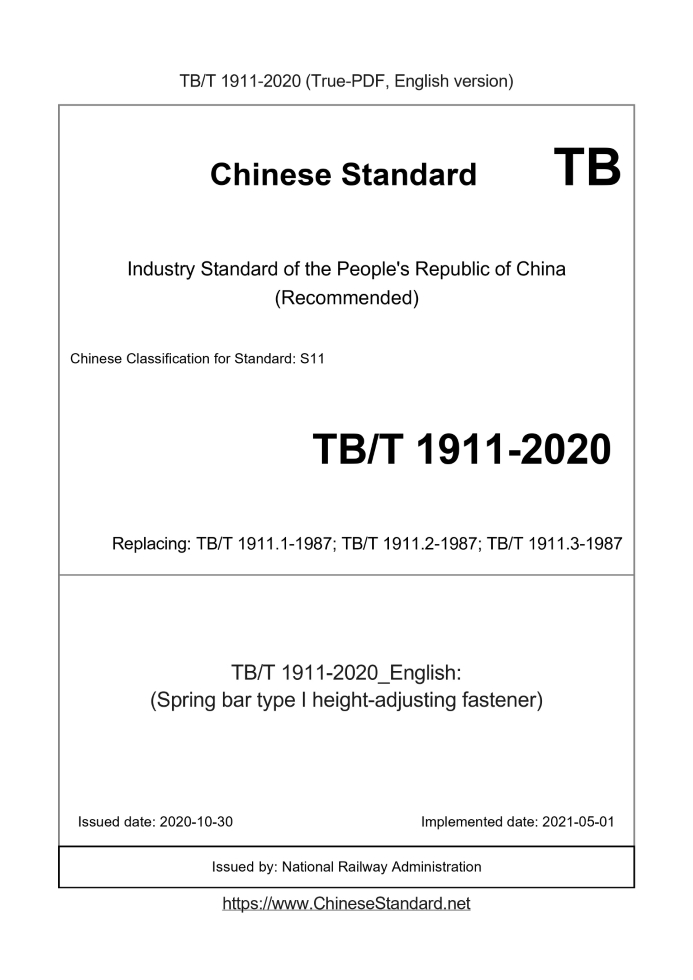 Delivery: <= 4 days. True-PDF full-copy in English will be manually translated and delivered via email. TB/T 1911-2020: (Spring bar type I height-adjusting fastener) Status: Valid TB/T 1911: Historical versions