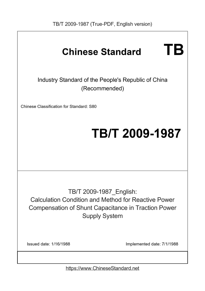 Delivery: <= 3 days. True-PDF full-copy in English will be manually translated and delivered via email. TB/T 2009-1987: Calculation Condition and Method for Reactive Power Compensation of Shunt Capacitance in Traction Power Supply System