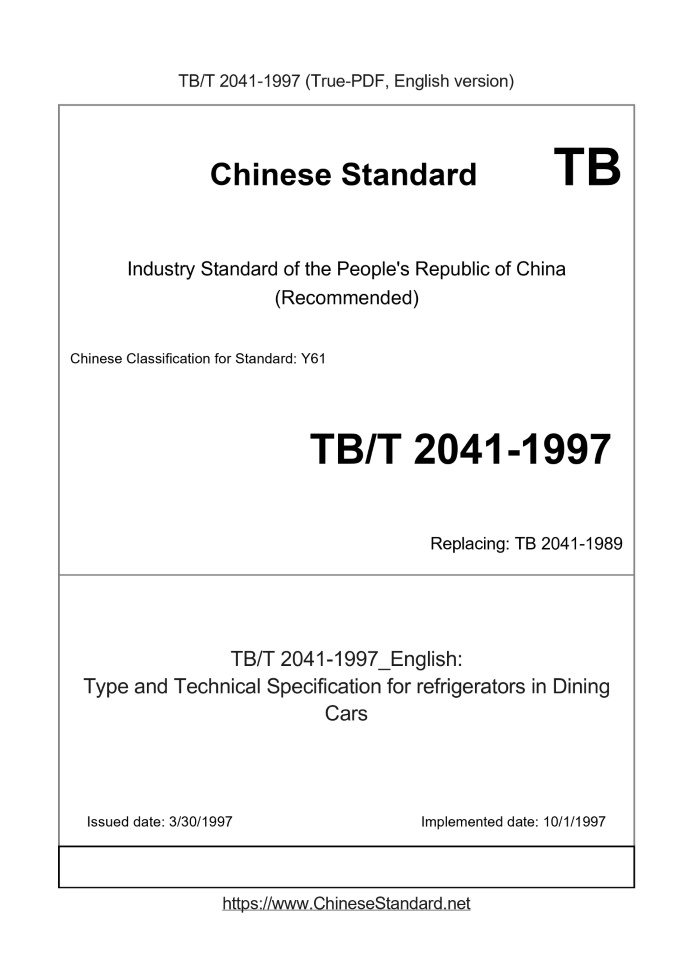 Delivery: <= 3 days. True-PDF full-copy in English will be manually translated and delivered via email. TB/T 2041-1997: Type and Technical Specification for refrigerators in Dining Cars TB/T 2041: Historical versions
