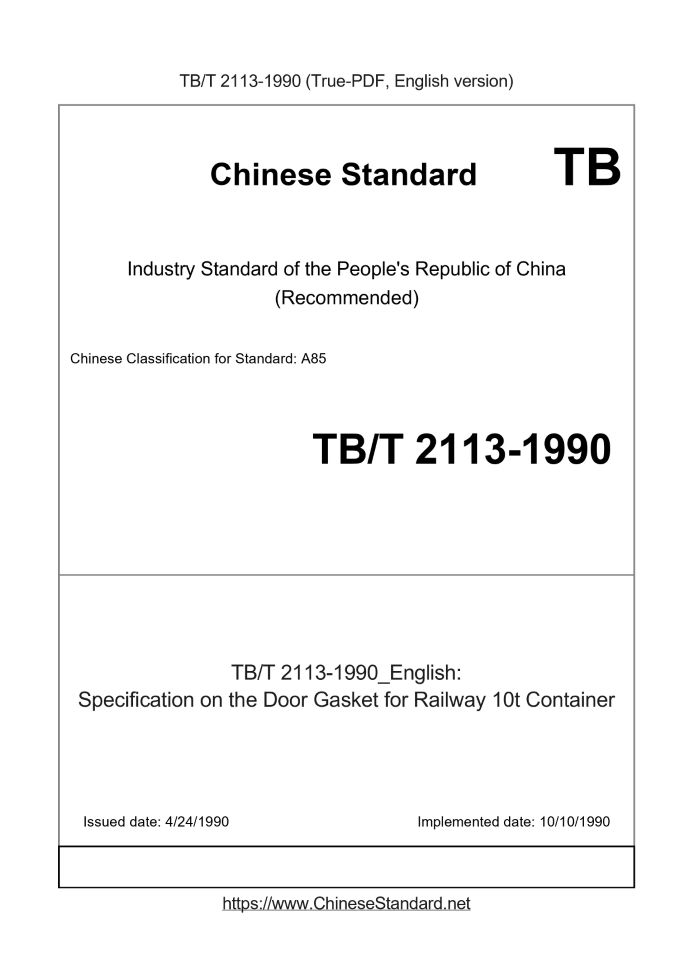 Delivery: <= 2 days. True-PDF full-copy in English will be manually translated and delivered via email. TB/T 2113-1990: Specification on the Door Gasket for Railway 10t Container