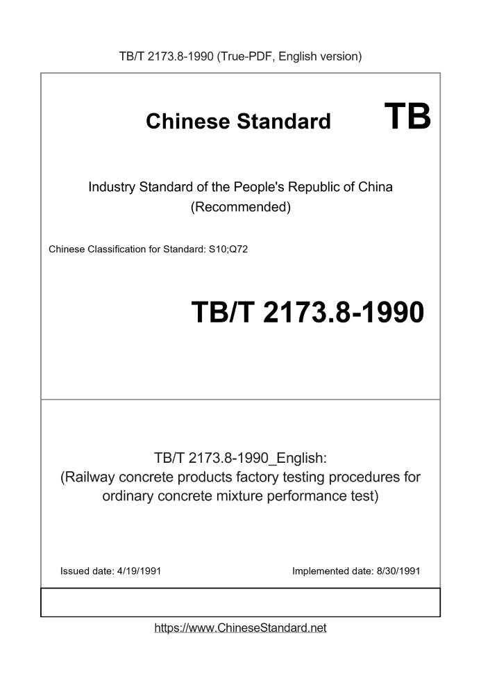 Delivery: <= 5 days. True-PDF full-copy in English will be manually translated and delivered via email. TB/T 2173.8-1990: (Railway concrete products factory testing procedures for ordinary concrete mixture performance test) Status: Obsolete