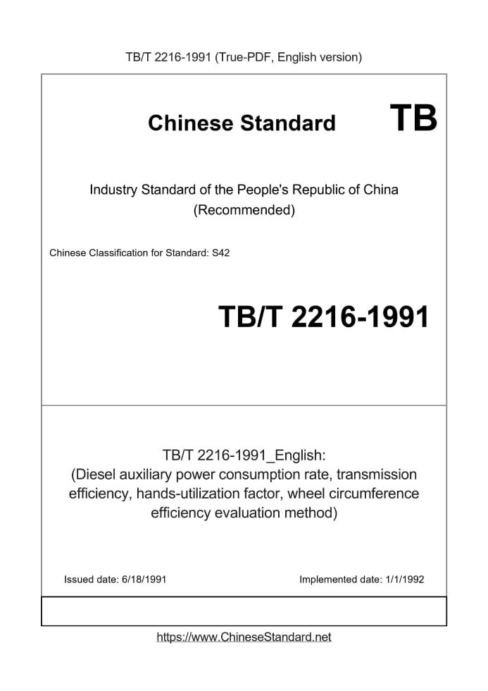Delivery: <= 3 days. True-PDF full-copy in English will be manually translated and delivered via email. TB/T 2216-1991: (Diesel auxiliary power consumption rate, transmission efficiency, hands-utilization factor, wheel circumference efficiency evaluation method) Status: Obsolete
