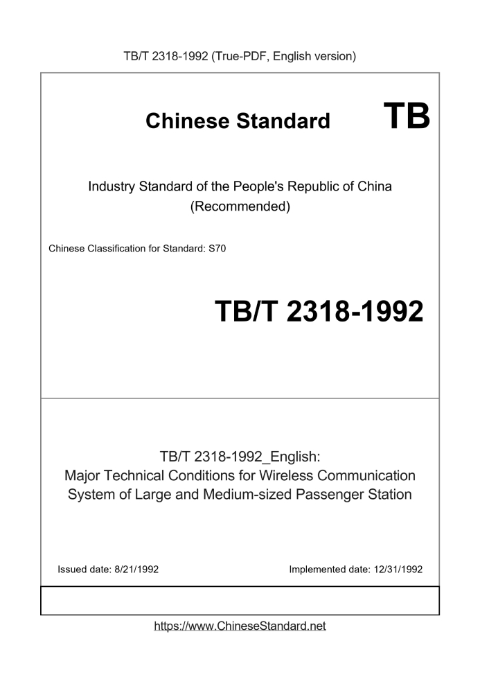 Delivery: <= 2 days. True-PDF full-copy in English will be manually translated and delivered via email. TB/T 2318-1992: Major Technical Conditions for Wireless Communication System of Large and Medium-sized Passenger Station