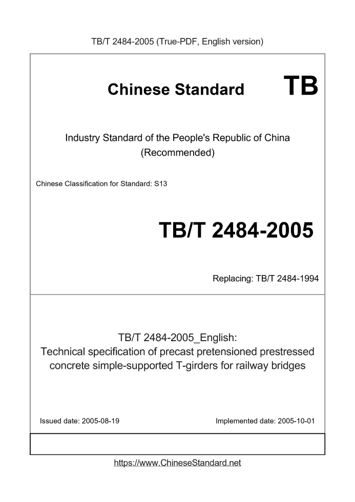 Delivery: <= 4 days. True-PDF full-copy in English will be manually translated and delivered via email. TB/T 2484-2005: Technical specification of precast pretensioned prestressed concrete simple-supported T-girders for railway bridges Status: Valid TB/T 2484: Historical versions