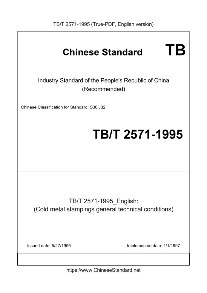 Delivery: <= 2 days. True-PDF full-copy in English will be manually translated and delivered via email. TB/T 2571-1995: (Cold metal stampings general technical conditions) Status: Obsolete