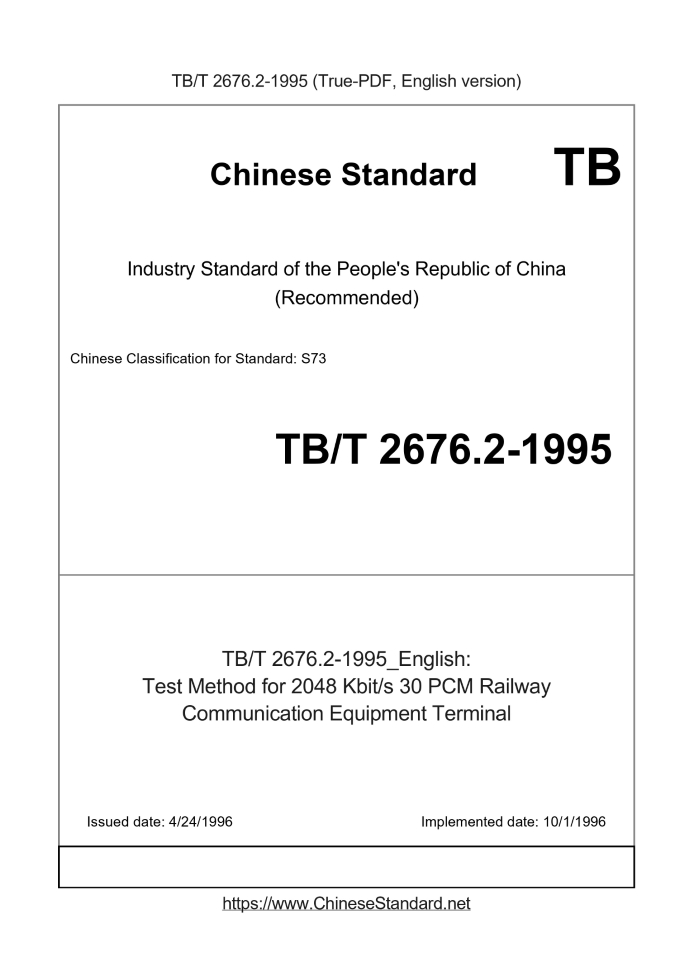 Delivery: <= 4 days. True-PDF full-copy in English will be manually translated and delivered via email. TB/T 2676.2-1995: Test Method for 2048 Kbit/s 30 PCM Railway Communication Equipment Terminal