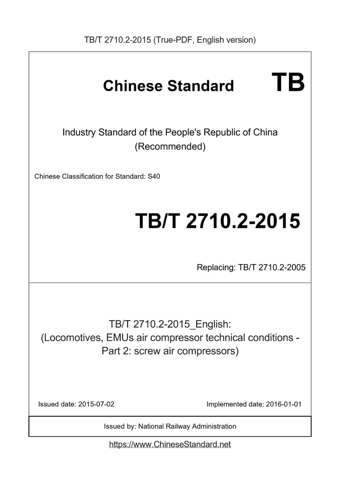 Delivery: <= 3 days. True-PDF full-copy in English will be manually translated and delivered via email. TB/T 2710.2-2015: (Locomotives, EMUs air compressor technical conditions - Part 2: screw air compressors) Status: Valid TB/T 2710.2: Historical versions