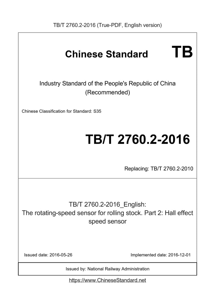 Delivery: <= 3 days. True-PDF full-copy in English will be manually translated and delivered via email. TB/T 2760.2-2016: The rotating-speed sensor for rolling stock. Part 2: Hall effect speed sensor Status: Valid TB/T 2760.2: Historical versions