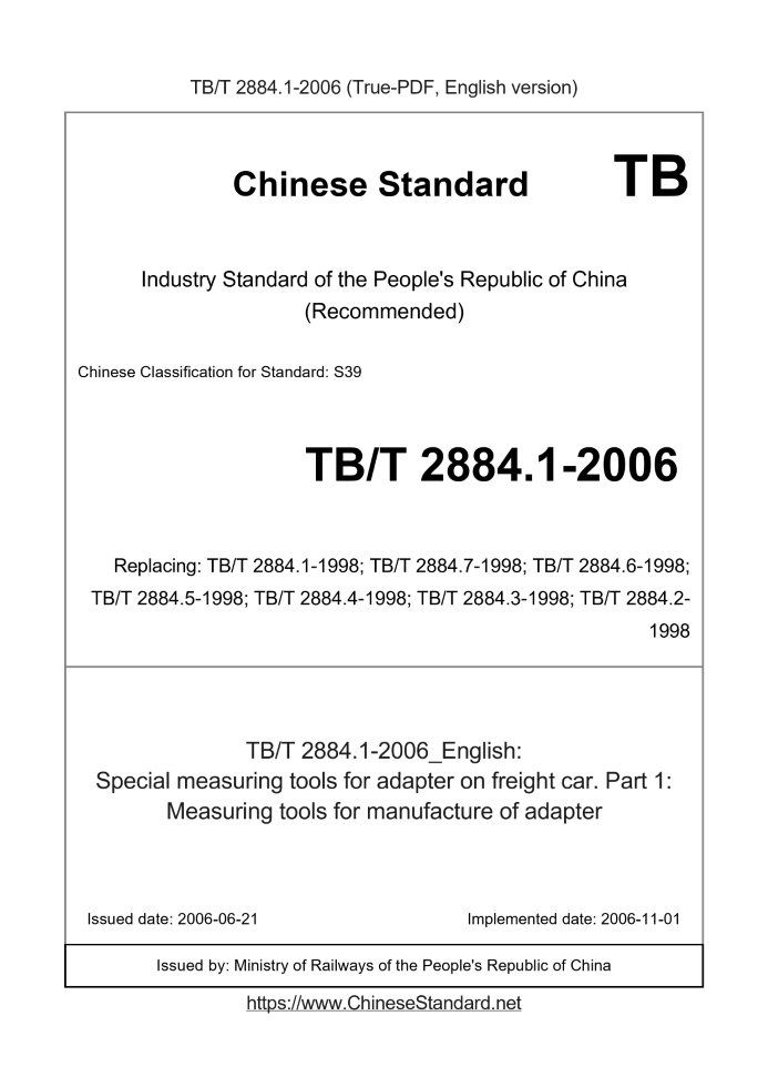 Delivery: <= 5 days. True-PDF full-copy in English will be manually translated and delivered via email. TB/T 2884.1-2006: Special measuring tools for adapter on freight car. Part 1: Measuring tools for manufacture of adapter Status: Valid TB/T 2884.1: Historical versions