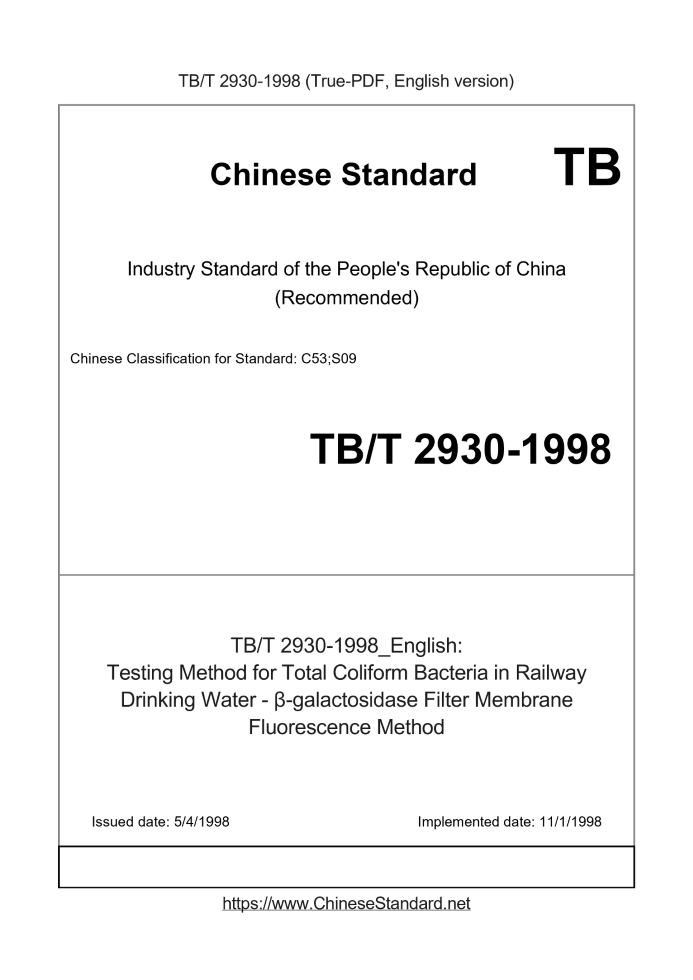 Delivery: <= 3 days. True-PDF full-copy in English will be manually translated and delivered via email. TB/T 2930-1998: Testing Method for Total Coliform Bacteria in Railway Drinking Water - β-galactosidase Filter Membrane Fluorescence Method
