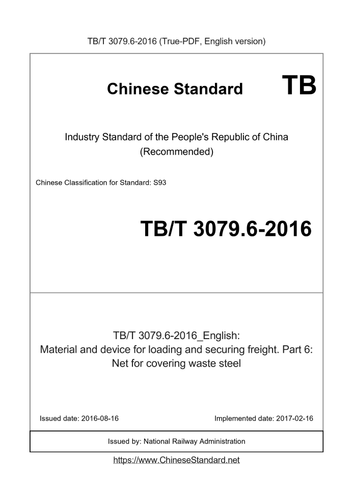 Delivery: <= 3 days. True-PDF full-copy in English will be manually translated and delivered via email. TB/T 3079.6-2016: Material and device for loading and securing freight. Part 6: Net for covering waste steel Status: Valid