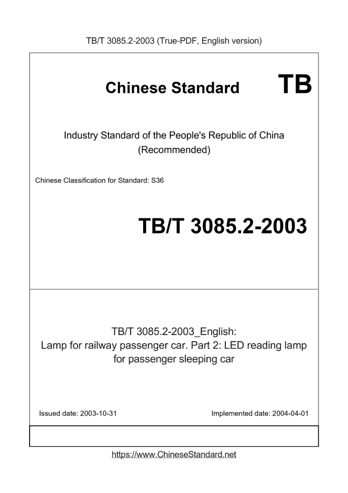 Delivery: <= 3 days. True-PDF full-copy in English will be manually translated and delivered via email. TB/T 3085.2-2003: Lamp for railway passenger car. Part 2: LED reading lamp for passenger sleeping car Status: Obsolete