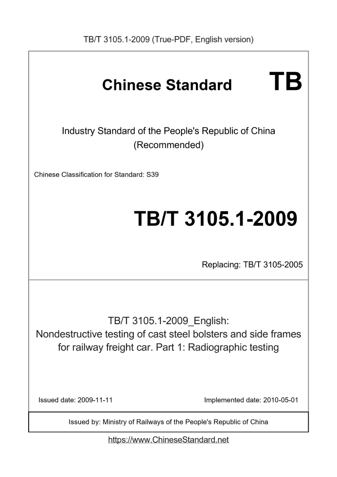 Delivery: <= 4 days. True-PDF full-copy in English will be manually translated and delivered via email. TB/T 3105.1-2009: Nondestructive testing of cast steel bolsters and side frames for railway freight car. Part 1: Radiographic testing Status: Valid TB/T 3105.1: Historical versions