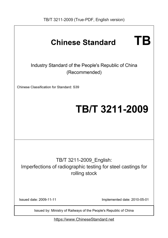 Delivery: <= 6 days. True-PDF full-copy in English will be manually translated and delivered via email. TB/T 3211-2009: Imperfections of radiographic testing for steel castings for rolling stock Status: Valid