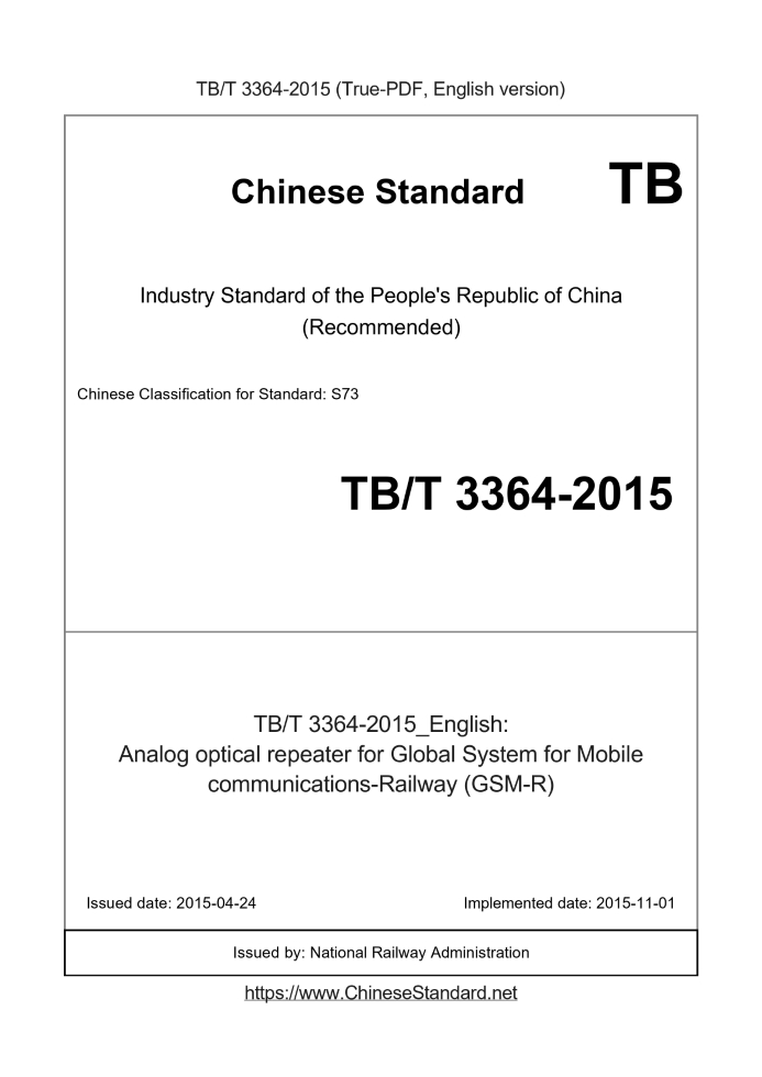 Delivery: <= 4 days. True-PDF full-copy in English will be manually translated and delivered via email. TB/T 3364-2015: Analog optical repeater for Global System for Mobile communications-Railway (GSM-R) Status: Valid