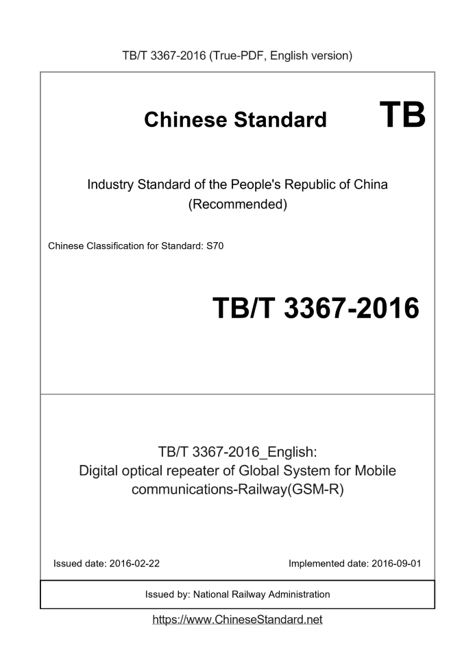 Delivery: <= 5 days. True-PDF full-copy in English will be manually translated and delivered via email. TB/T 3367-2016: Digital optical repeater of Global System for Mobile communications-Railway(GSM-R) Status: Valid