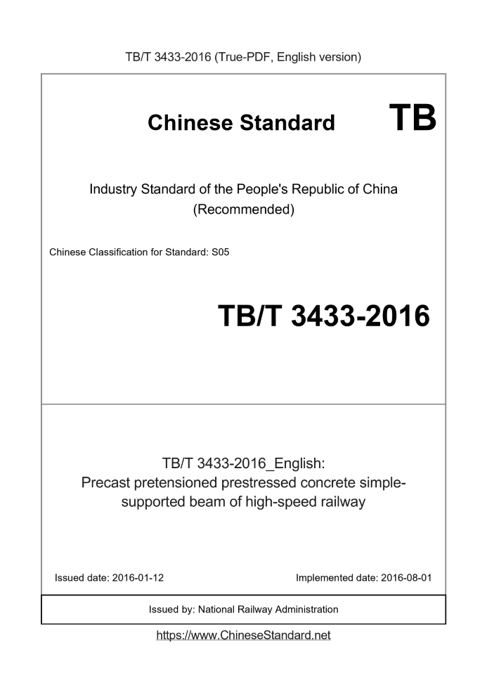 Delivery: <= 5 days. True-PDF full-copy in English will be manually translated and delivered via email. TB/T 3433-2016: Precast pretensioned prestressed concrete simple-supported beam of high-speed railway Status: Valid