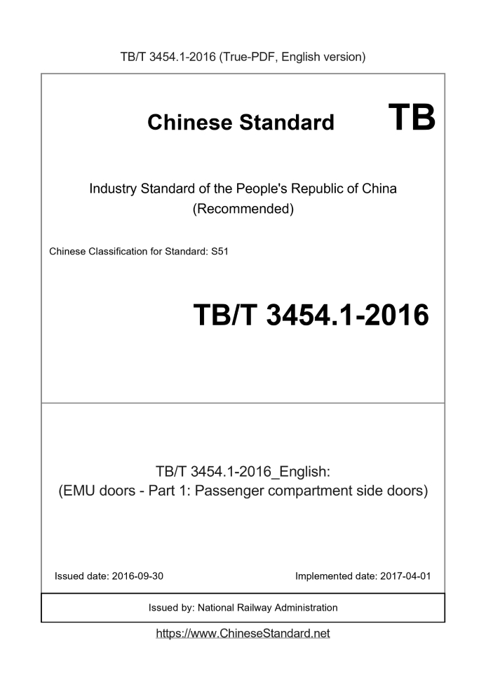Delivery: <= 4 days. True-PDF full-copy in English will be manually translated and delivered via email. TB/T 3454.1-2016: (EMU doors - Part 1: Passenger compartment side doors) Status: Valid