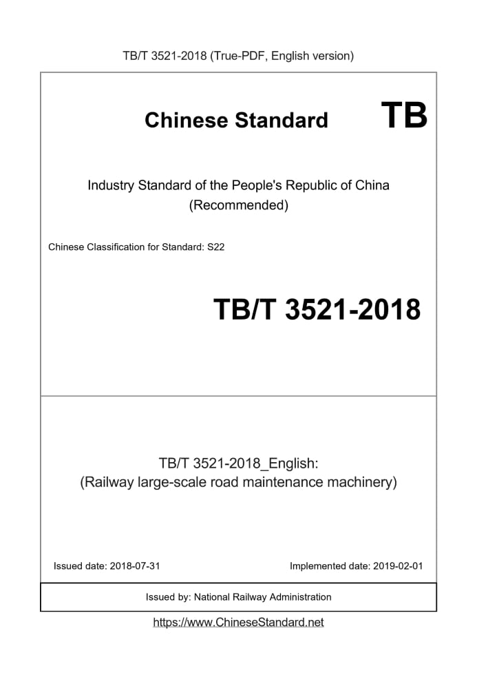 Delivery: <= 3 days. True-PDF full-copy in English will be manually translated and delivered via email. TB/T 3521-2018: (Railway large-scale road maintenance machinery) Status: Valid