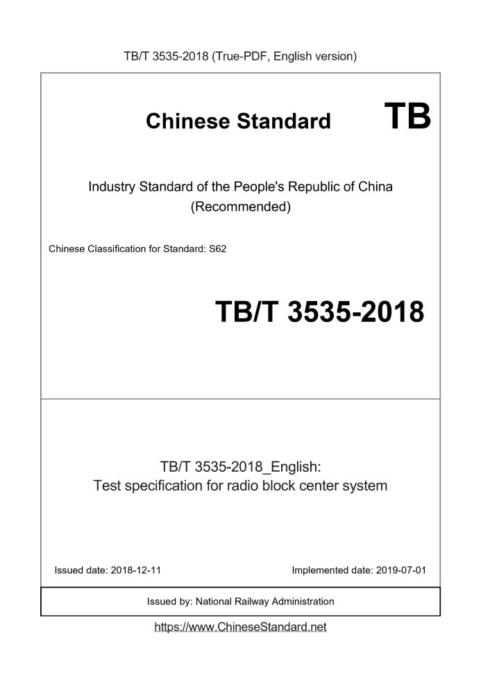 Delivery: <= 8 days. True-PDF full-copy in English will be manually translated and delivered via email. TB/T 3535-2018: Test specification for radio block center system Status: Valid