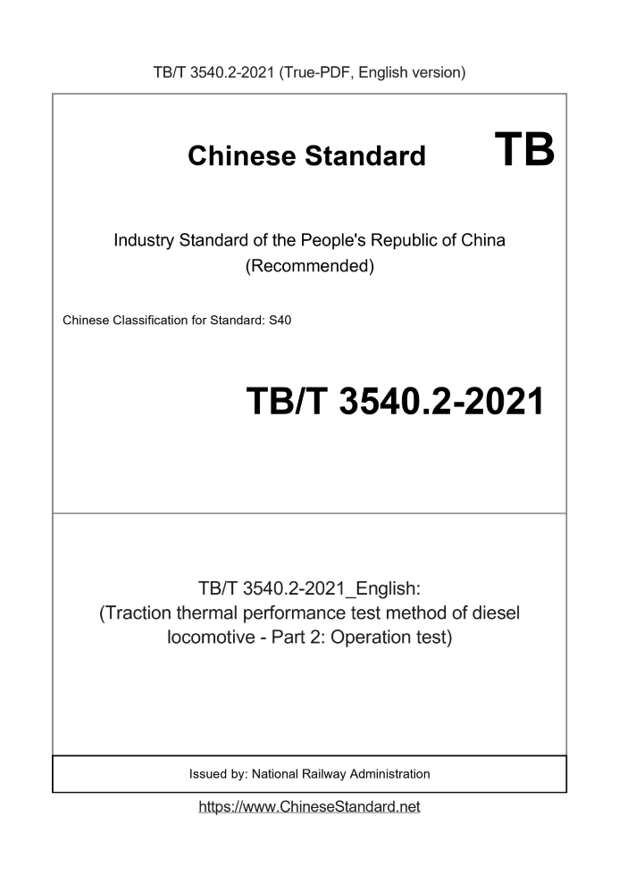 Delivery: <= 3 days. True-PDF full-copy in English will be manually translated and delivered via email. TB/T 3540.2-2021: (Traction thermal performance test method of diesel locomotive - Part 2: Operation test) Status: Valid