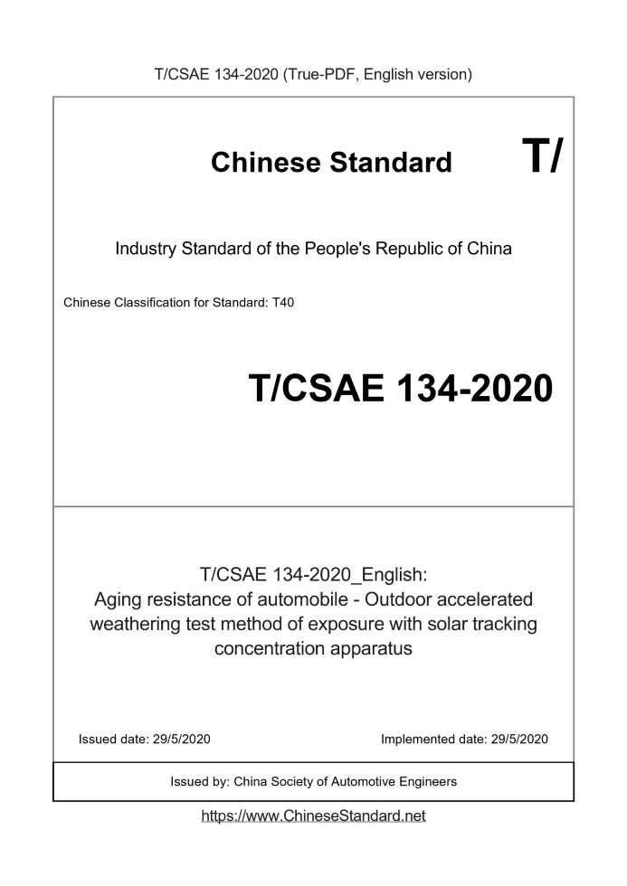 Delivery: <= 3 days. True-PDF full-copy in English will be manually translated and delivered via email. TCSAE134-2020: Aging resistance of automobile - Outdoor accelerated weathering test method of exposure with solar tracking concentration apparatus