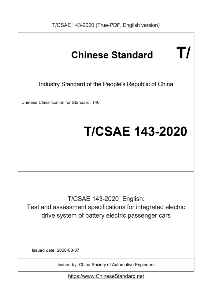 Delivery: <= 3 days. True-PDF full-copy in English will be manually translated and delivered via email. TCSAE143-2020: Test and assessment specifications for integrated electric drive system of battery electric passenger cars