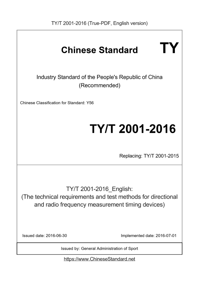 Basic dataStandard ID: TY/T 2001-2016 (TY/T2001-2016)Description (Translated English): (The technical requirements and test methods for directional and radio frequency measurement timing devices) Sector / Industry: Sports Industry Standard (Recommended) Classification of Chinese Standard: Y56 Date of Issue: 2016-06-30 Date of Implementation: 2016-07-01 Regulation (derived from): General Administration of Sport Announcement No.26 Issuing agency(ies): General Administration of Sport TYT2001-2015: (National Physical Fitness Testing Equipment General requirements)---This is a DRAFT version for illustration, not a final translation. Full copy of true-PDF in English version (including equations, symbols, images, flow-chart, tables, and figures etc.) will be manually/carefully translated upon your order.(National Physical Fitness Testing Equipment General requirements) ICS 97.220.99 Y56 People's Republic of China sports industry standards General requirements for national physique testing equipment Published on.2014-06-03 2015-07-01 implementation The General Administration of Sport of the People's Republic of China ContentForeword I 1 Scope 1 2 Normative references 1 3 Terms and Definitions 2 4 Classification and basic parameters 3 5 Requirements 6 6 Test method 8 7 Inspection rules 14 8 Marking, packaging, transport and storage 15 Appendix A (Normative) Balance Beam 17 Appendix B (Normative) Auxiliary Equipment Requirements 18 Appendix C (Normative) Pressure Correction Method 19 Appendix D (informative) Correspondence relationship of test equipment 20ForewordThis standard was drafted in accordance with the rules given in GB/T 1.1-2009. This standard was proposed by the Sports Goods Standardization Office of the State General Administration of Sport. This standard is under the jurisdiction of the Sports Economics Department of the State General Administration of Sport. This standard was drafted. Beijing National Sports Quality Certification Center, Liaoning Institute of Metrology, National Sports General Administration Science Research Institute, Dandong Tiankang Technology Industrial Group Co., Ltd., Tongfang Health Technology (Beijing) Co., Ltd., Shenzhen Good Family Industry Company, Ningbo Qisheng Sports Equipment Co., Ltd., Shenzhen Hengkang Jiaye Technology Co., Ltd., Dalian Wanguo Huitong Sports Investment Management Co., Ltd. the company. The main drafters of this standard. Hou Libo, Zhang Baoguo, Wang Mei, Qi Ruigang, Zhang Yadong, Zeng Xinhuang, Huang Jianlin, Liu Peiming, Yan Xiaogang, Zhang Xiaojing, Chen Xiaotong. General requirements for national physique testing equipment1 ScopeThis standard specifies the terms and definitions, classification and basic parameters, requirements, and tests of national physical fitness testing equipment (hereinafter referred to as testing equipment). Methods, inspection rules and marking, packaging, transportation and storage. This standard applies to test equipment for people aged 3 to 69 years old.2 Normative referencesThe following documents are indispensable for the application of this document. For dated references, only dated versions apply to this article. Pieces. For undated references, the latest edition (including all amendments) applies to this document. GB/T 191 packaging storage and transportation icon GB 3053-1993 sphygmomanometer and blood pressure meter GB 4943.1-2011 Safety of information technology equipment - Part 1. General requirements GB 5296.1 Instructions for use of consumer goods - Part 1. General GB 17498.1-2008 Fixed fitness equipment - Part 1. General safety requirements and test methods Stationary fitness equipment - Part 6. Particular safety requirements and test methods for treadmills GB 19272-2011 General requirements for safety of outdoor fitness equipment GB/T 19851.4-2005 Primary and secondary school sports equipment and venues Part 4. Basketball GB/T 19851.5-2005 Primary and secondary school sports equipment and venues Part 5. Volleyball GB/T 19851.6-2005 Primary and secondary school sports equipment and venues - Part 6. Soft volleyball GB/T 19851.12-2005 Primary and secondary school sports equipment and venues Part 12. Student physical fitness test equipment GB/T 19851.18-2007 Primary and secondary school sports equipment and venues - Part 18. GB/T 19851.20-2007 Primary and secondary school sports equipment and venues - Part 20 GB/T 19851.21-2007 Primary and secondary school sports equipment and venues Part 21. Ryukyu, flower garden GB/T 22754-2008 Tennis GB/T 22773-2008 mechanical stopwatch GB/T 22778-2008 LCD digital quartz stopwatch GB/T 22892-2008 football GB/T 23111-2008 Non-automatic weighing instrument JJG5 fiber tape measure and rope test procedure JJG237 stopwatch verification procedure JJG270 sphygmomanometer and blood pressure meter verification procedures JJG692 non-invasive automatic measurement sphygmomanometer JJF1001-2011 General Measurement Terms and Definitions QB/T 1519-2011 Fiber Tape Measure SJ/T 11363-2006 Limitation requirements for toxic and hazardous substances in electronic information products SJ/T 11365-2006 Methods for the detection of toxic and hazardous substances in electronic information products TY/T 2001-2015 (National Physical Fitness Testing Equipment General requirements) ICS 97.220.99 Y56 People's Republic of China sports industry standards General requirements for national physique testing equipment Generalrequirements-Testingequipmentofnationalphysicalfitness Published on.2014-06-03 2015-07-01 implementation The General Administration of Sport of the People's Republic of ChinaContentForeword I 1 Scope 1 2 Normative references 1 3 Terms and Definitions 2 4 Classification and basic parameters 3 5 Requirements 6 6 Test method 8 7 Inspection rules 14 8 Marking, packaging, transport and storage 15 Appendix A (Normative) Balance Beam 17 Appendix B (Normative) Auxiliary Equipment Requirements 18 Appendix C (Normative) Pressure Correction Method 19 Appendix D (informative) Corres