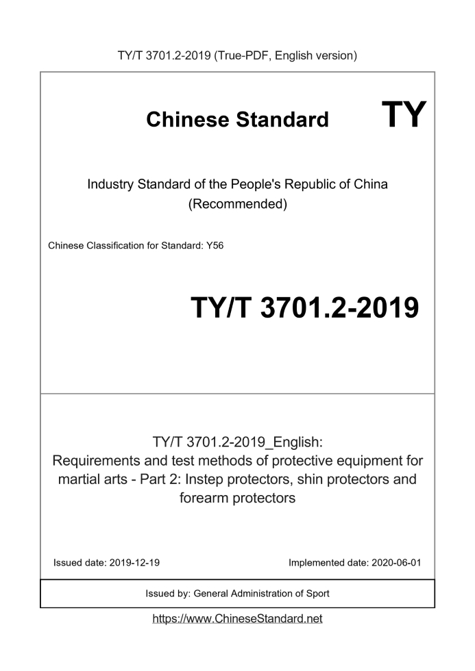 Delivery: <= 3 days. True-PDF full-copy in English will be manually translated and delivered via email. TYT3701.2-2019: Requirements and test methods of protective equipment for martial arts - Part 2: Instep protectors, shin protectors and forearm protectors Status: Valid