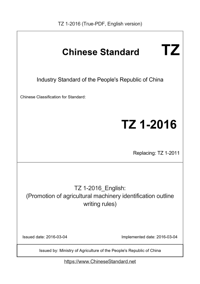 | TZ 1-2016 | English | RFQ | ASK | 3 days [Need to translate] | (Promotion of agricultural machinery identification outline writing rules) |