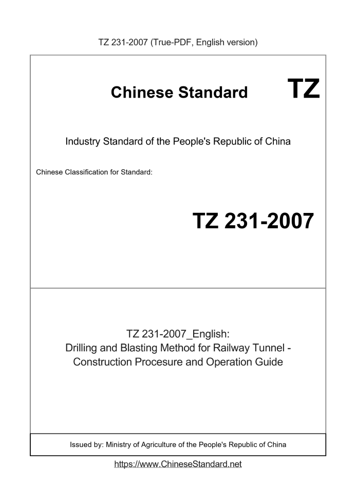 | TZ 231-2007 | English | RFQ | ASK | 3 days [Need to translate] | Drilling and Blasting Method for Railway Tunnel - Construction Procesure and Operation Guide |