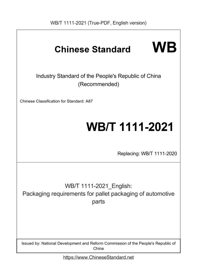 Delivery: <= 3 days. True-PDF full-copy in English will be manually translated and delivered via email. WBT1111-2021: Packaging requirements for pallet packaging of automotive parts Status: Valid WBT1111: Historical versions