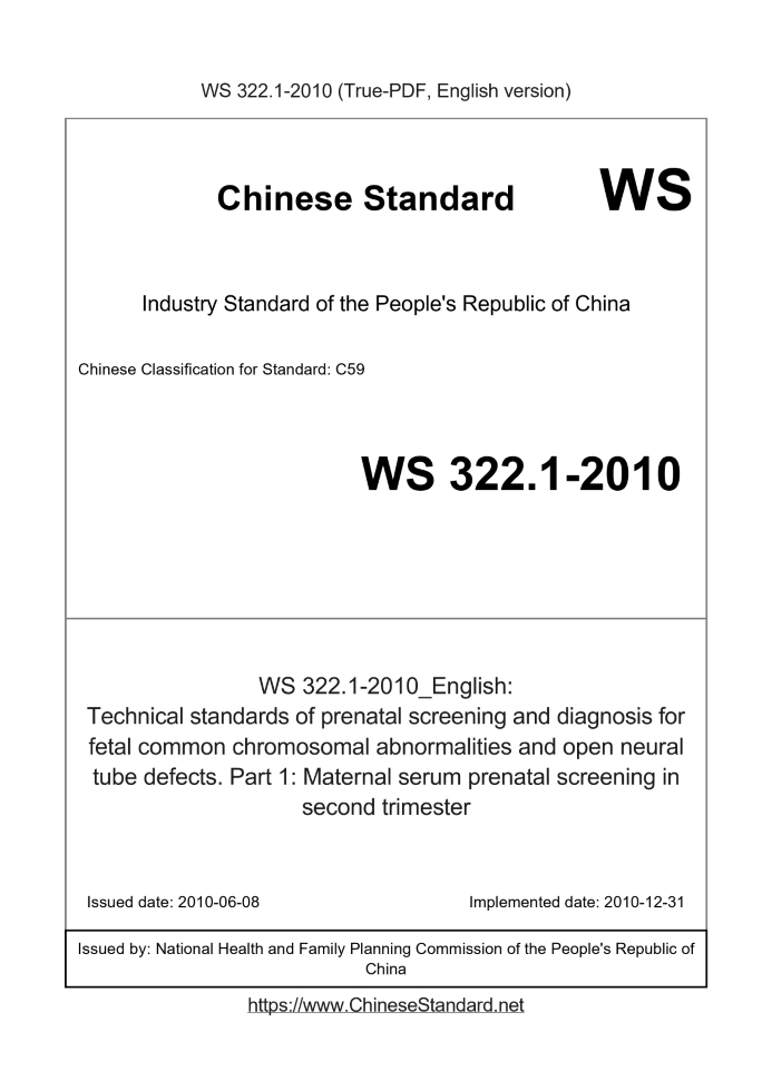 | Description (Translated English) | Technical standards of prenatal screening and diagnosis for fetal common chromosomal abnormalities and open neural tube defects. Part 1: Maternal serum prenatal screening in second trimester |