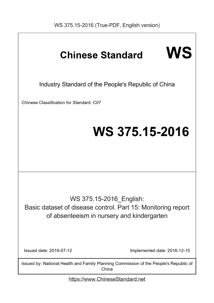 US$279.00 · In stock · Download in 9 secondsWS 375.15-2016: Basic dataset of disease control. Part 15: Monitoring report of absenteeism in nursery and kindergarten