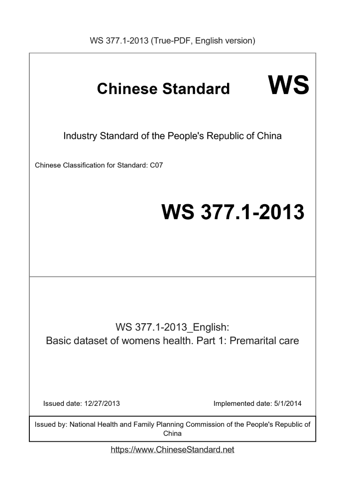 Delivery: <= 4 days. True-PDF full-copy in English will be manually translated and delivered via email. WS 377.1-2013: Basic dataset of womens health. Part 1: Premarital care Status: Valid