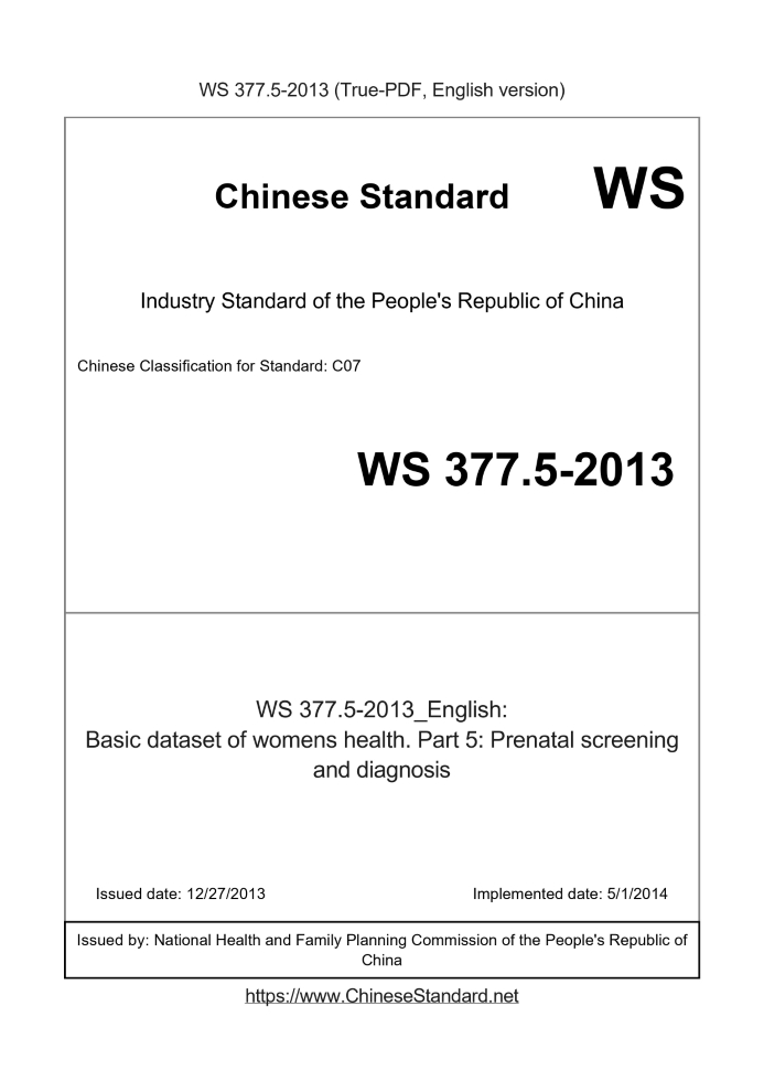 | Summary | This standard specifies the data set prenatal screening and diagnosis dataset metadata attributes and attribute data elements. This standard applies to prenatal screening and diagnosis to guide the country's development of basic information gathering, sto |