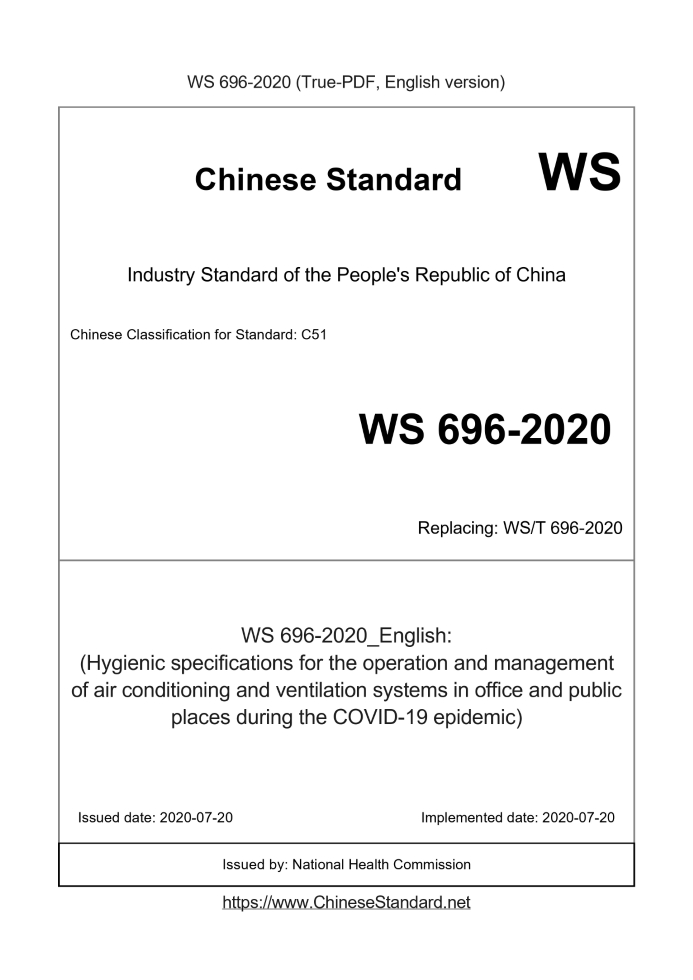 Delivery: <= 3 days. True-PDF full-copy in English will be manually translated and delivered via email. WS 696-2020: (Hygienic specifications for the operation and management of air conditioning and ventilation systems in office and public places during the COVID-19 epidemic) Status: Valid WS 696: Historical versions
