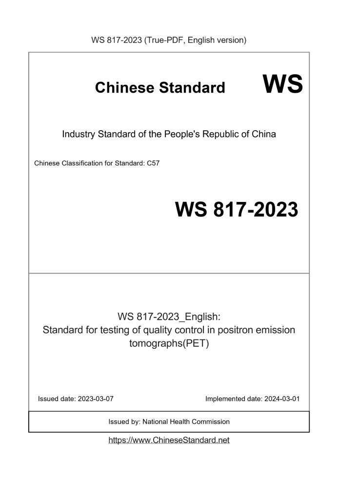 Delivery: <= 5 days. True-PDF full-copy in English will be manually translated and delivered via email. WS 817-2023: Standard for testing of quality control in positron emission tomographs(PET) Status: Valid