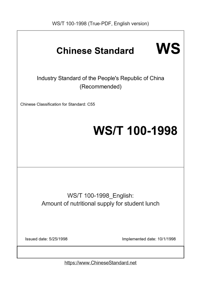 | WS/T 100-1998 | English | 239 | Add to Cart | 3 days [Need to translate] | Amount of nutritional supply for student lunch |
